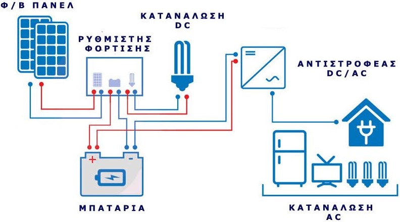 Ένα αυτόνομο φωτοβολταϊκό με αποθήκευση περιλαμβάνει πέρα από τα φωτοβολταϊκά πλαίσια και τους συσσωρευτές, έναν ελεγκτή φόρτισης, ο οποίος ελέγχει τους κύκλους φόρτισης και εκφόρτισης των μπαταριών, ανάλογα με τη ζήτηση των καταναλώσεων και τις συνθήκες ηλιοφάνειας και έναν αντιστροφέα μετατροπής της τάσης από συνεχή σε εναλλασσόμενη.
